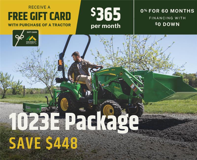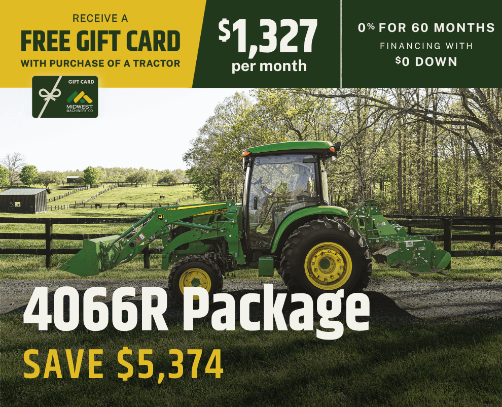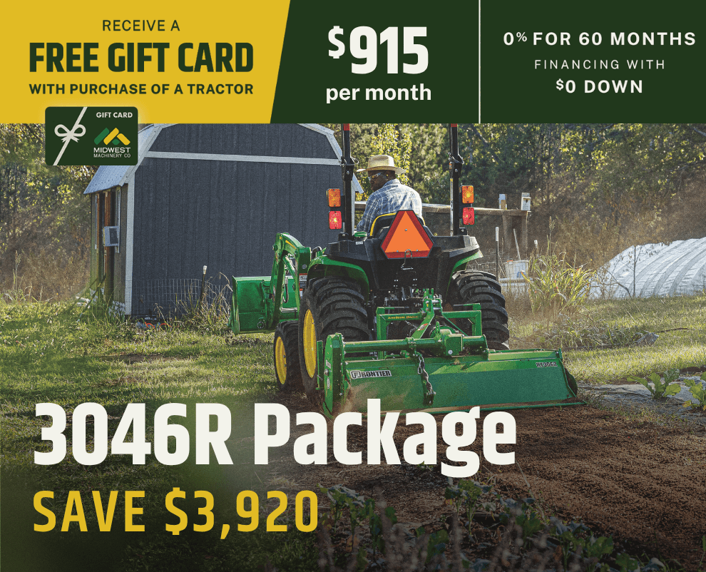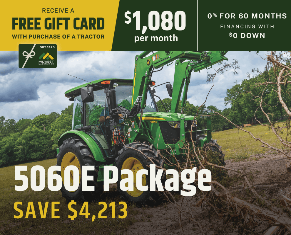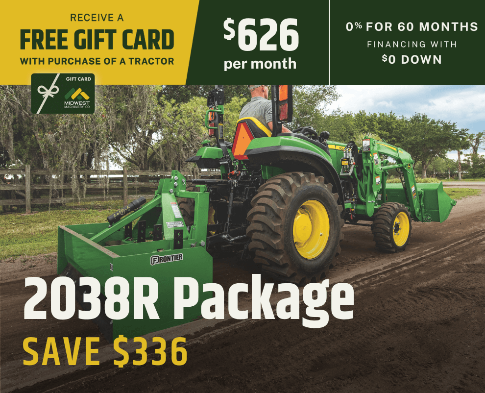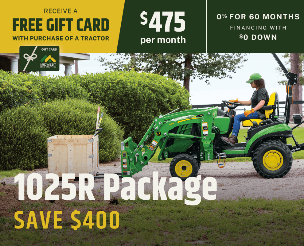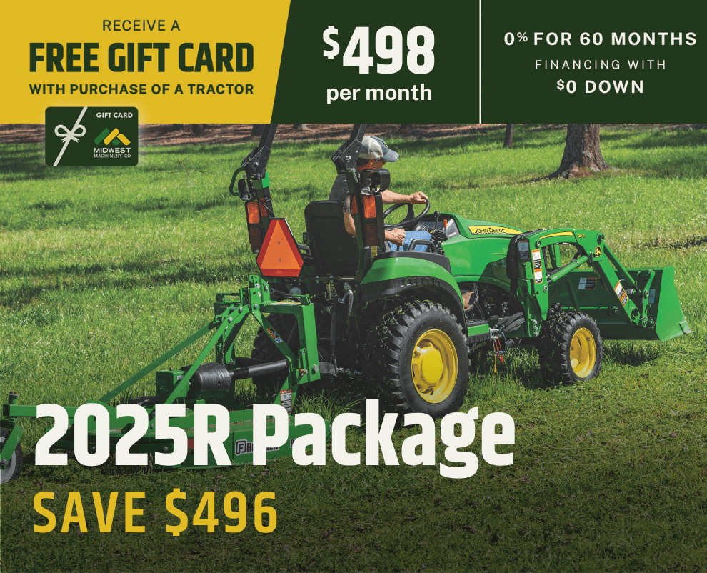 Offers and discounts valid to customers with an address inside Midwest Machinery's Area of Responsibility (AOR). Total savings for tractor packages based on MSRP pricing. Savings and financing offers valid on in-stock units only and good through May 31, 2026. Financing options available with approved credit through John Deere Financial. Package prices calculated with 0% down payment at 0% for 60 months. Some restrictions apply; see your local Midwest Machinery for details. Prices and monthly payment include installation and setup, but do not include sales tax.  Financing offers may require a financing fee.